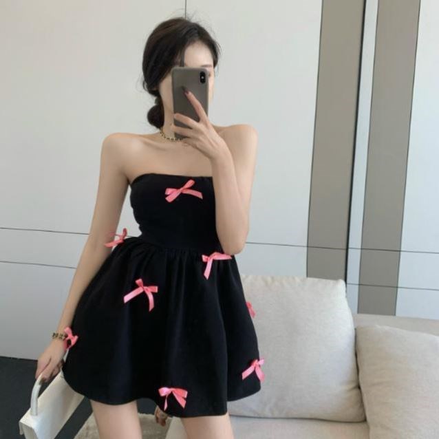 A chic strapless black mini dress crafted in soft Polyester fabric, highlighted with cute pink bow accents for a playful yet elegant look. Perfect for parties, dates, and evening outings.