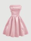 The strapless neckline highlights the shoulders, while the fitted bodice shapes the waist for a flattering silhouette. Finished with a graceful flared skirt and a statement satin bow at the back, this dress adds charm and femininity to your party look.